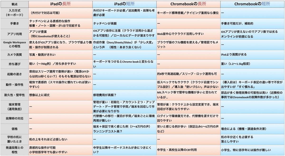ここまで、iPadとChromebookを学習面と管理・運用面の両方から整理してきました。