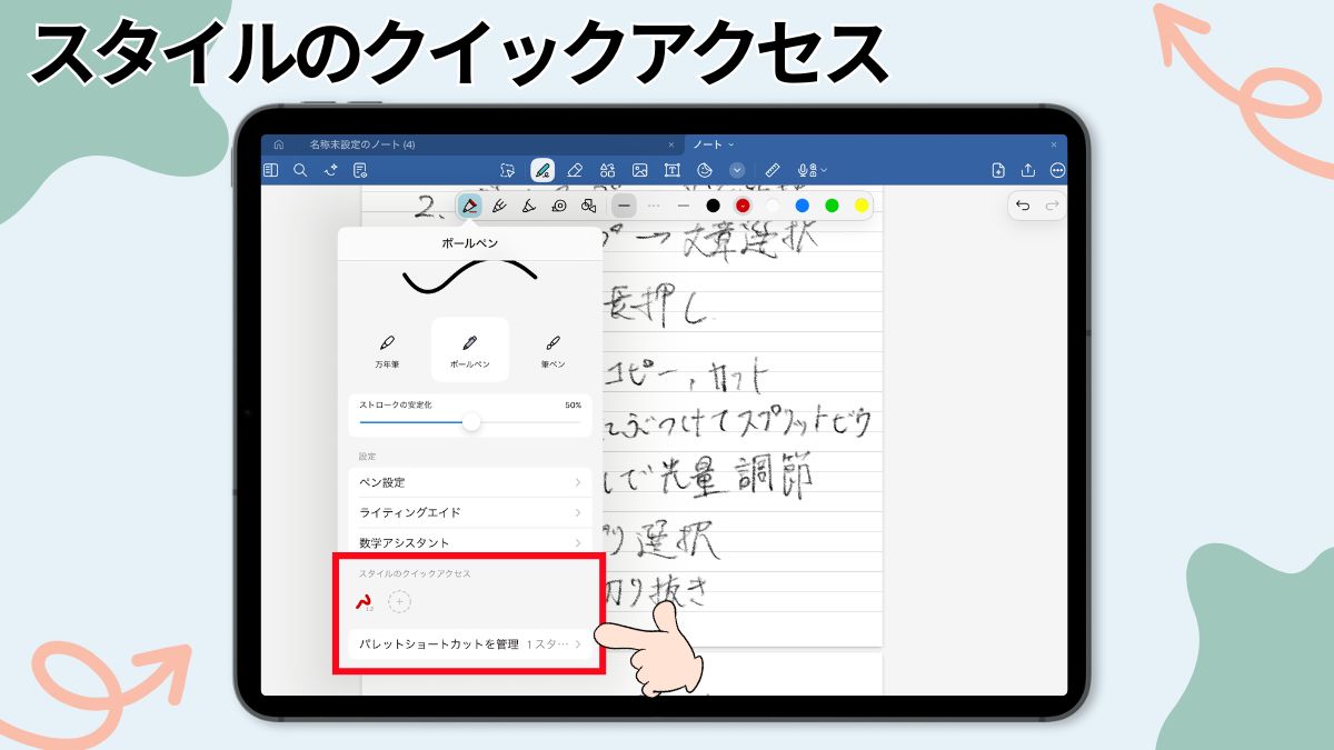 スタイルのクイックアクセスとは、よく使うペンの色や太さ、種類を保存しておき、すぐに呼び出せる機能です。