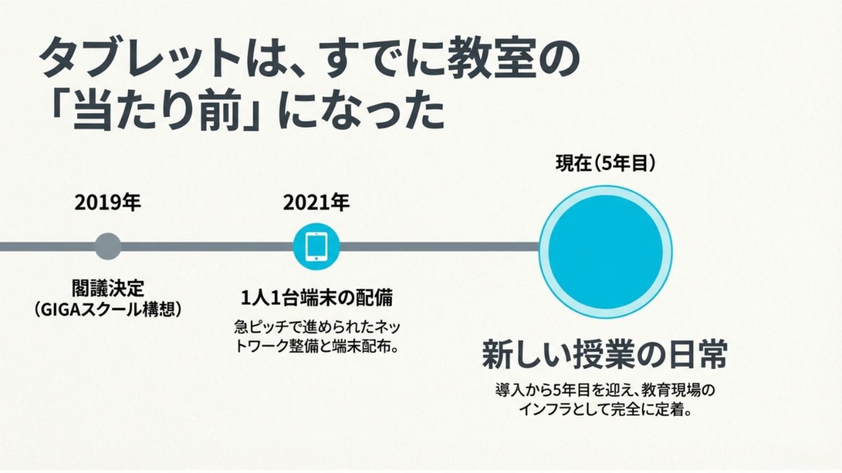 GIGAスクール構想は2019年に閣議決定され、子どもに1人1台のタブレット端末と高速大容量の通信ネットワークを全国の小学校に整備する取り組みが、急ピッチで進められました。