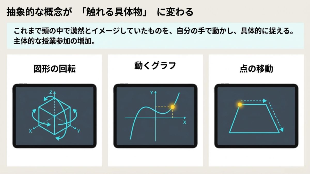 先生にタブレットの使い方のスキルがあれば、図形を回転させたり、グラフをリアルタイムで動かしたり、図形の上を点が移動する様子を見せたりすることができます。