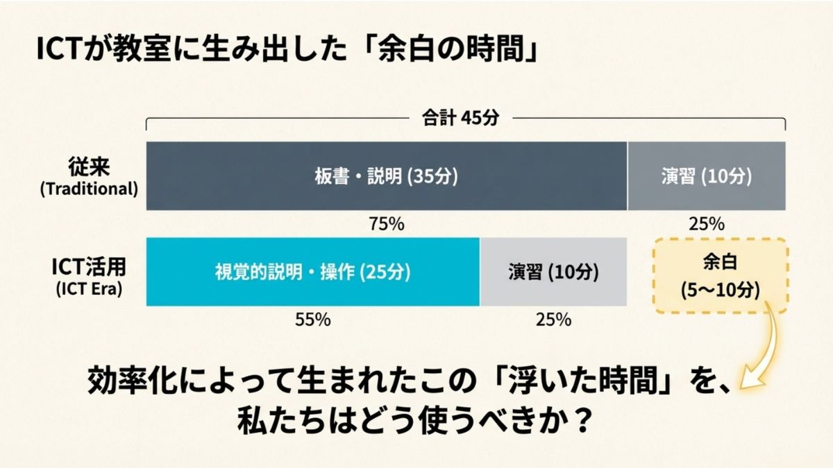 ICTの活用によって授業が効率化された結果、1時間の授業の中で、以前よりも5〜10分ほどの余白が生まれることがあります。